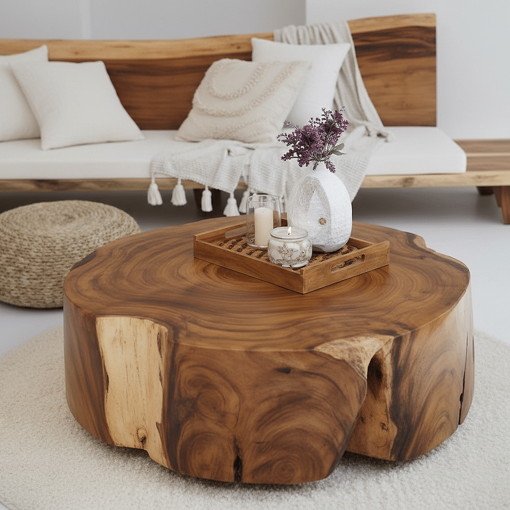 עץ סוואר מלא (Suar Wood): כל שולחן הוא יצירה חד-פעמית עם דוגמת סיבים טבעית וייחודית שאין לאף אחד אחר.