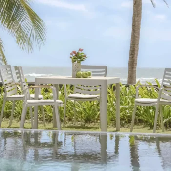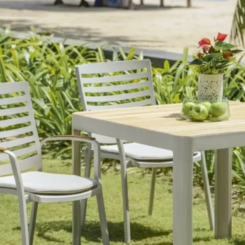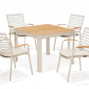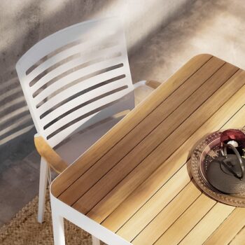 כיסא מעוצב ויוקרתי אשר בנוי משלדת אלומיניום “אל חלד” בשילוב משענות ידיים מעץ טיק אינדונזי.