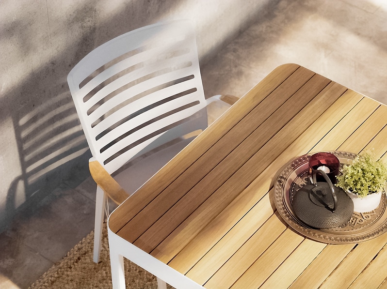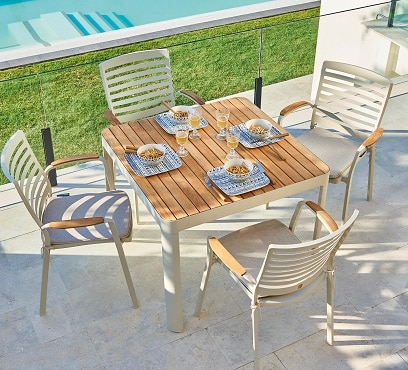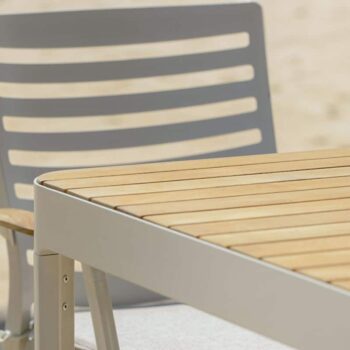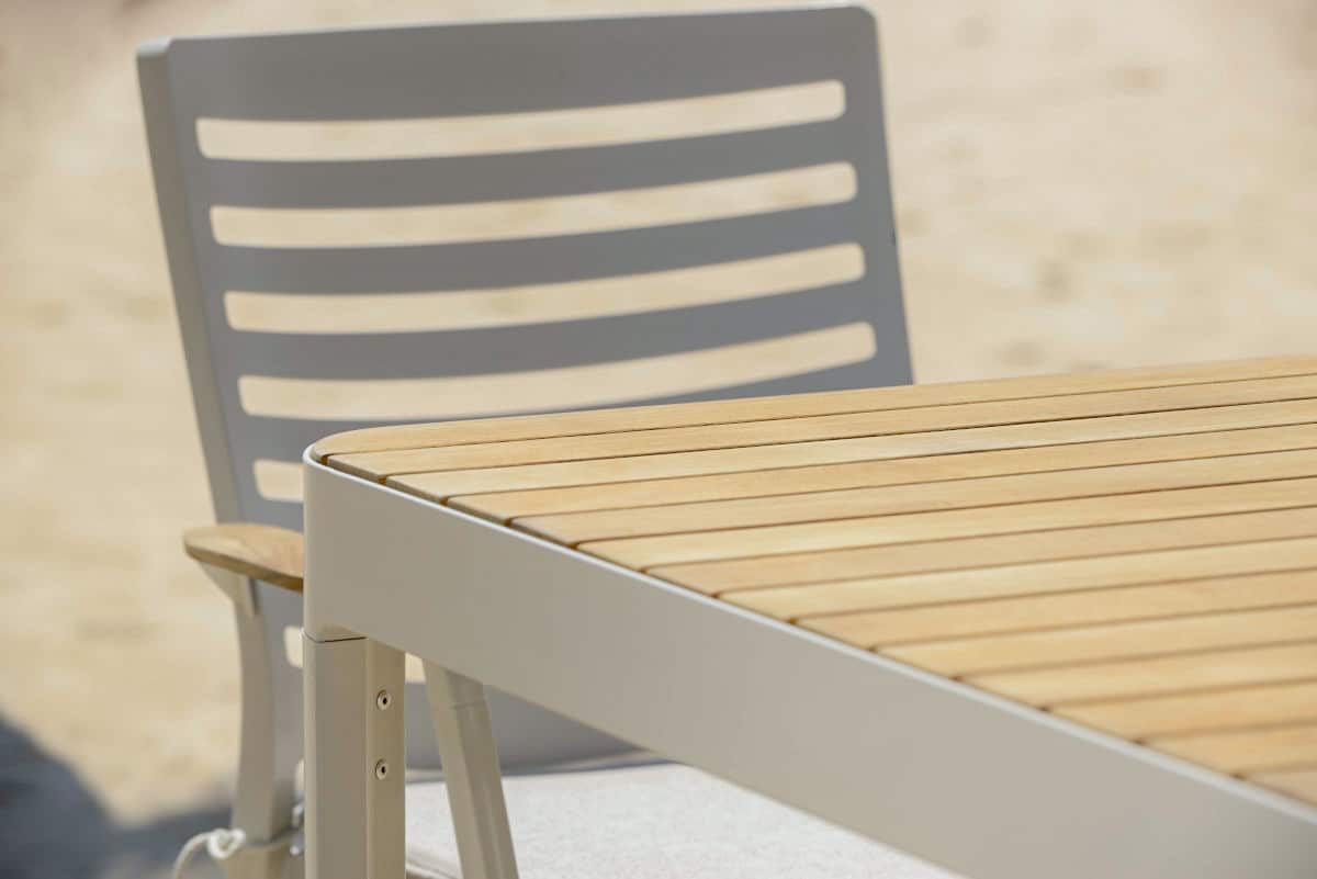 שולחן אלומיניום “אלד חלד” בשילוב לוחות עץ טיק אינדונזי.