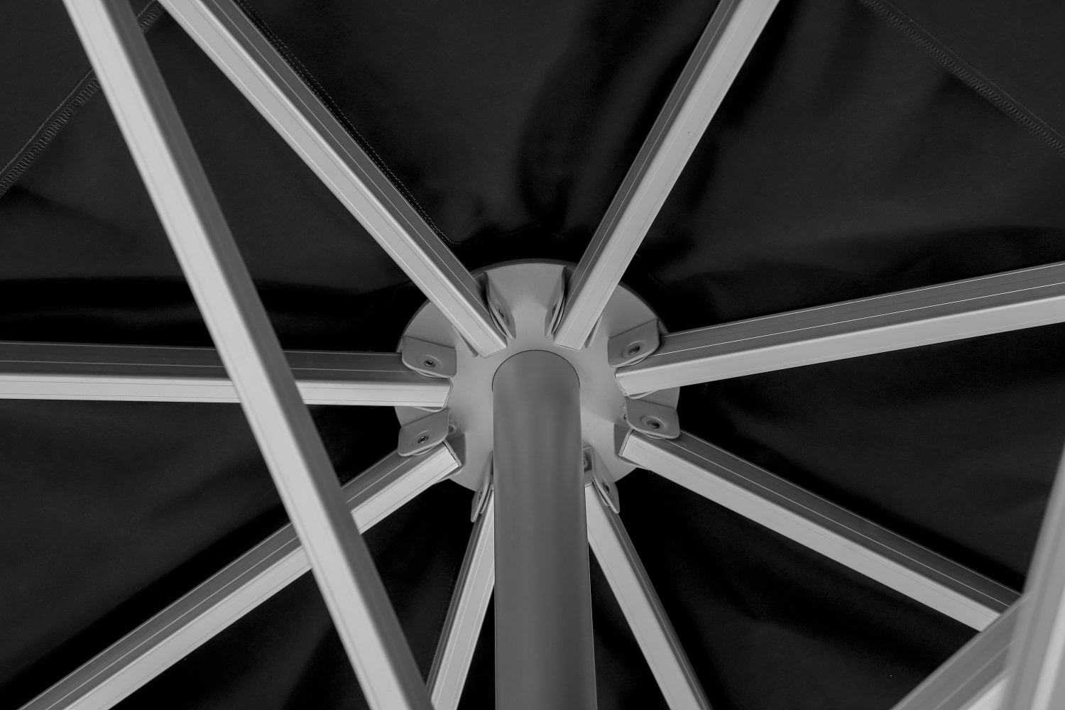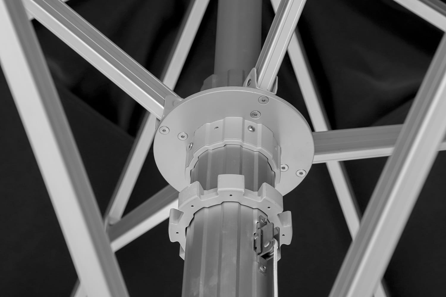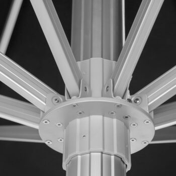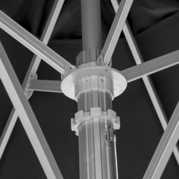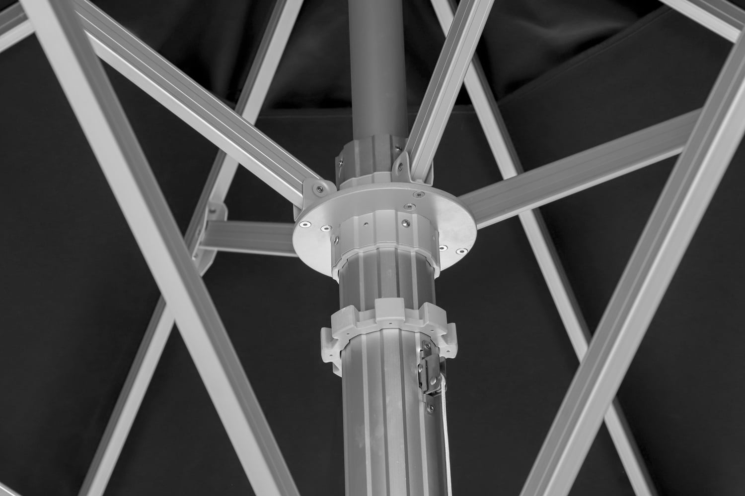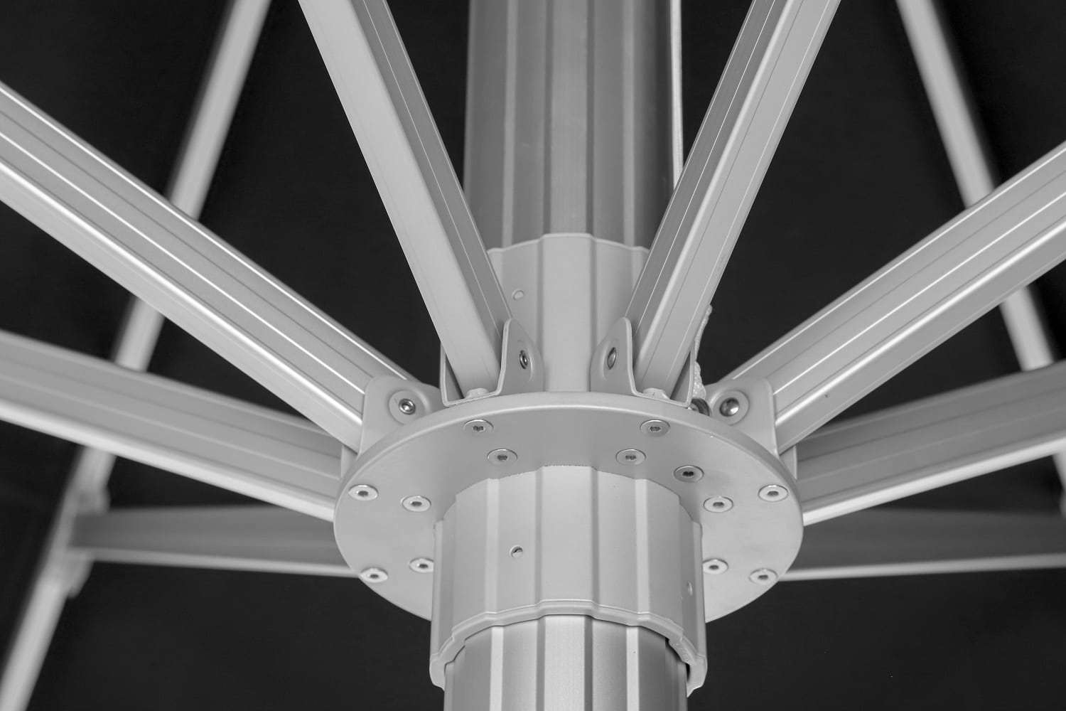 עמוד אלומיניום עבה במיוחד (100 מ”מ קוטר!) בשילוב 8 צלעות (דו שכבתיות) אלומיניום חזקות במיוחד אשר מוסיפות עמידות לשמשייה.